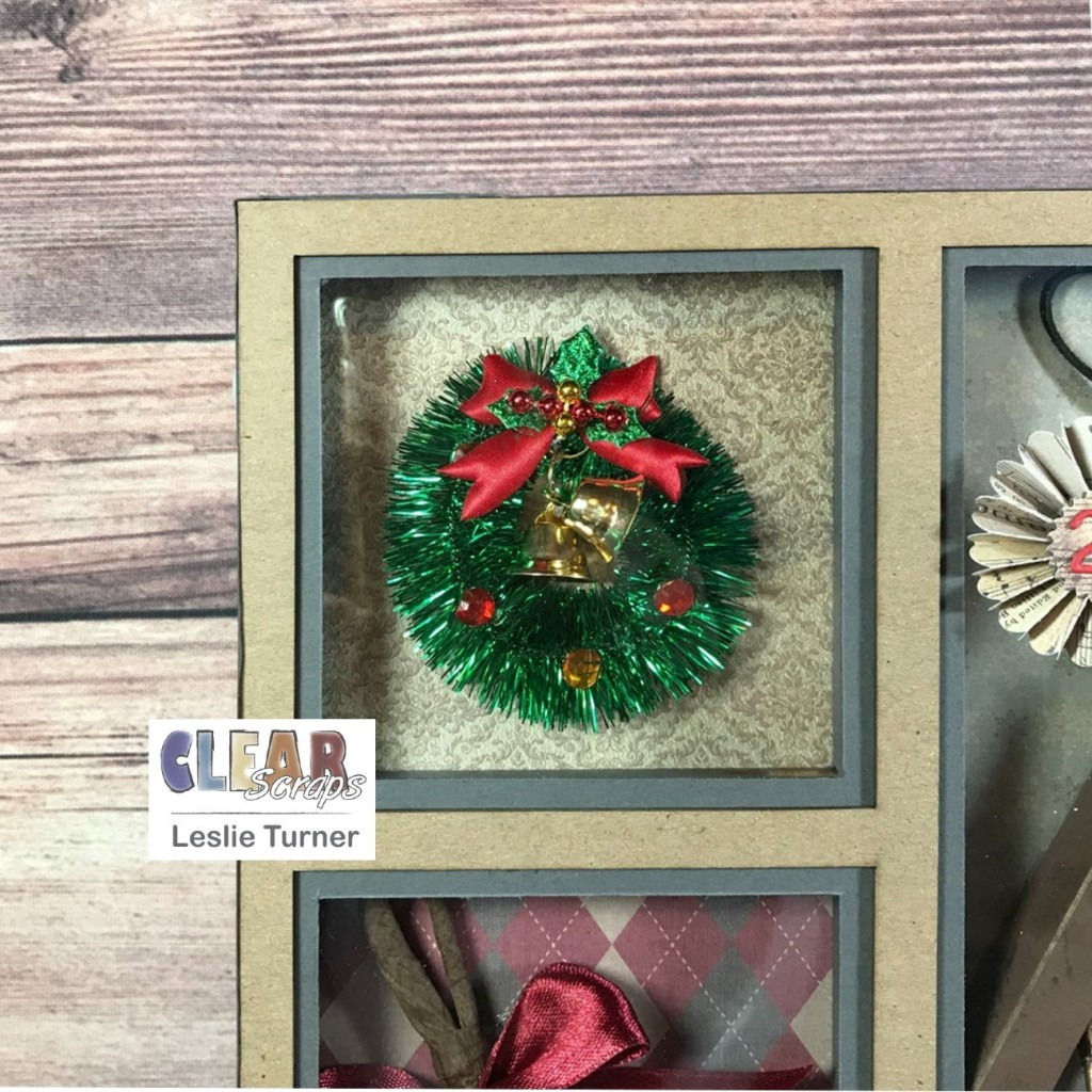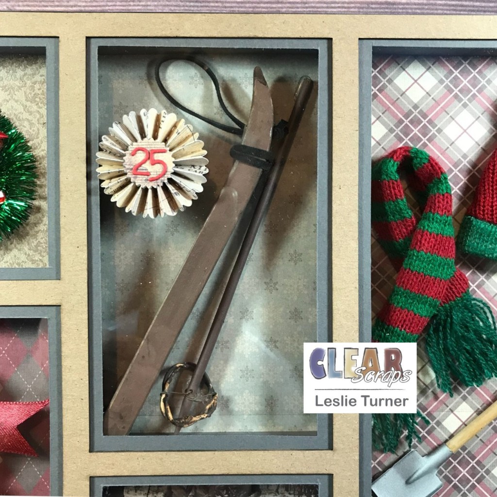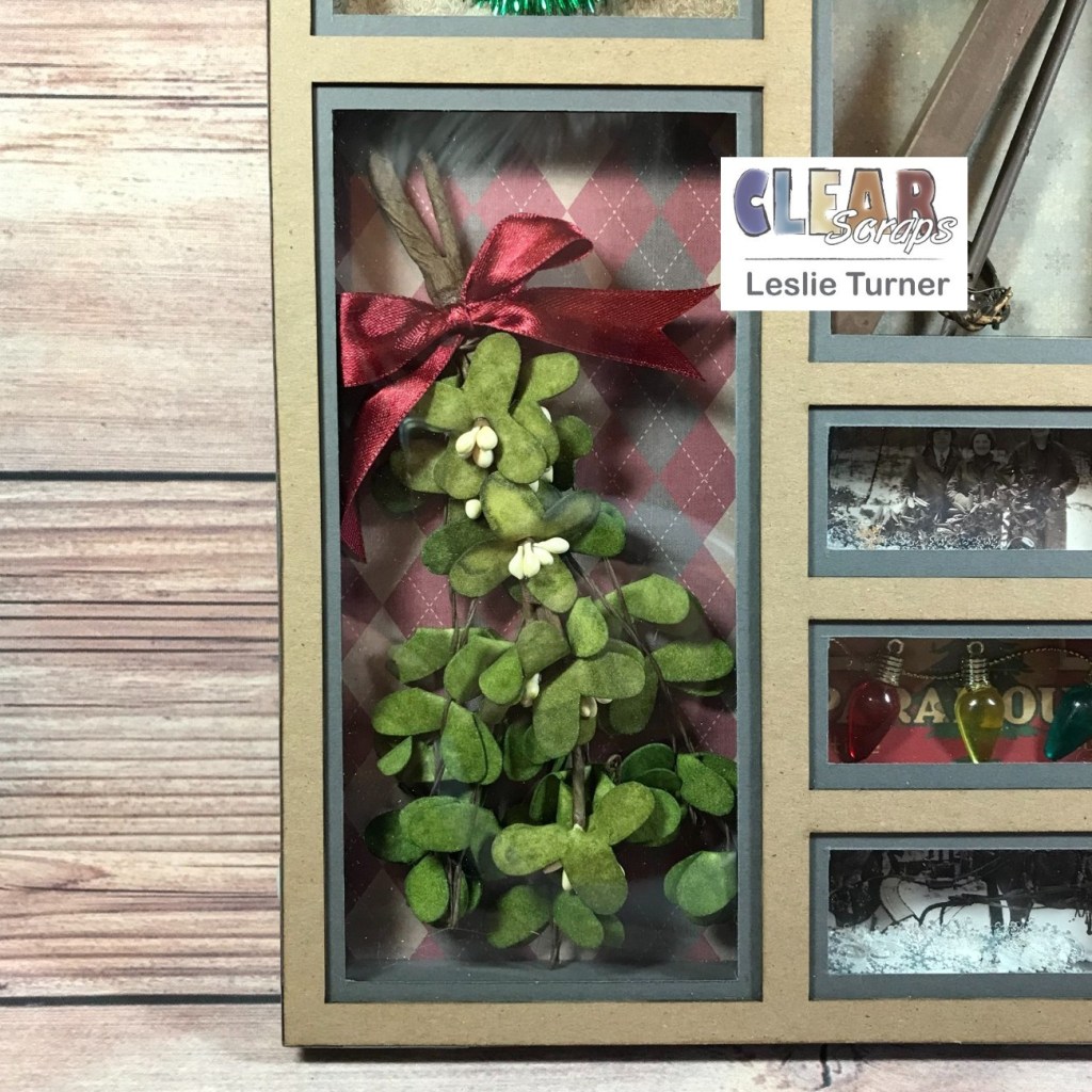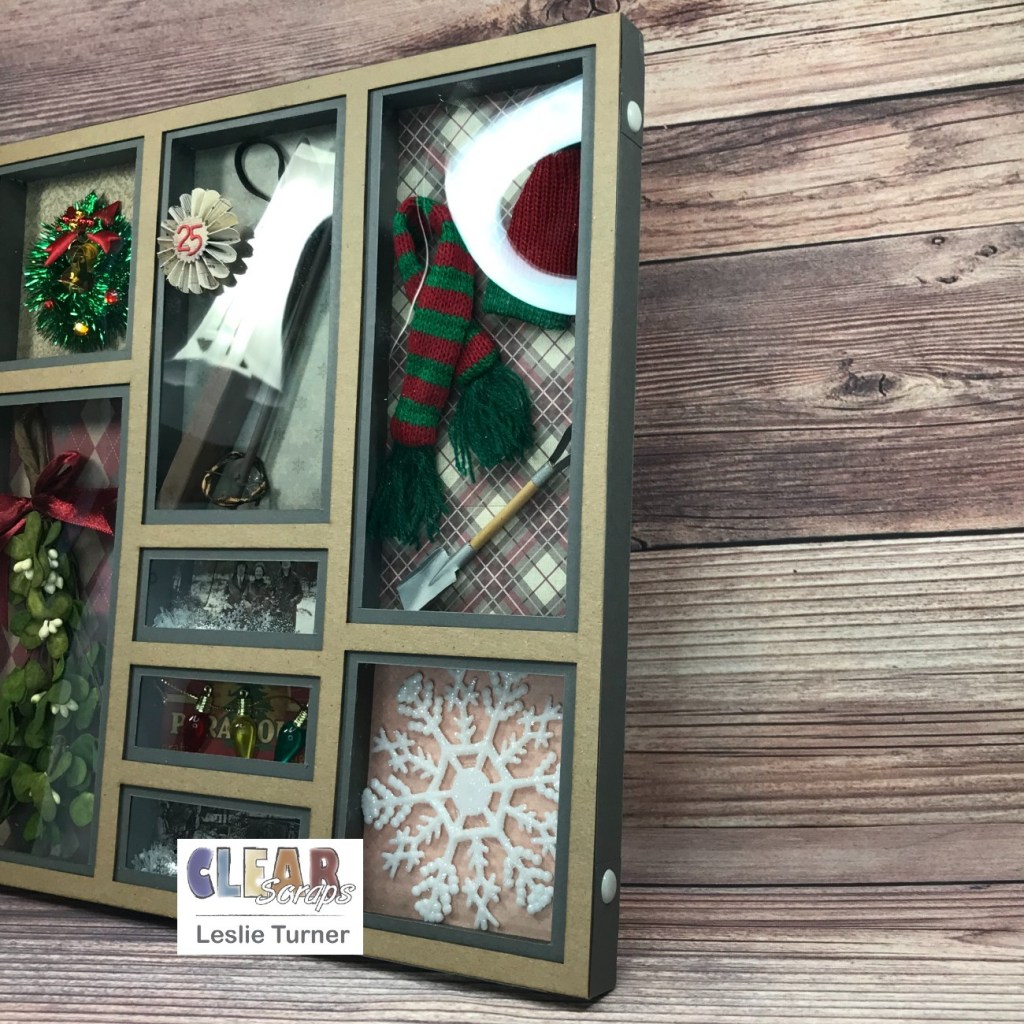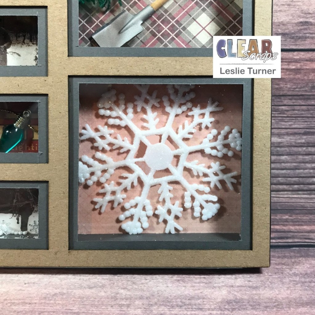 Hey, everybody! Welcome to another Monday closer to Christmas… it’s almost here! I hope you have all your Christmas crafting done or at least close to being done! I’m stoked to be back on the Clear Scraps blog today with another awesome DT inspiration project! I created a shadowbox from our Small Rectangle Printer Tray Frame, and I can’t tell you how much fun this was! I added several strips of double-sided adhesive foam tape between each of the chipboard layers so the compartments were deep enough to accommodate the vintage Christmas elements. I bought all of these fun vintage items (wreath, mistletoe, wood ski and pole, Christmas lights, scarf and hat, shovel, and snowflake) several years ago along with a different kind of shadowbox, and the shadowbox turned out to be too small, so everything just sat in my stash… until now!