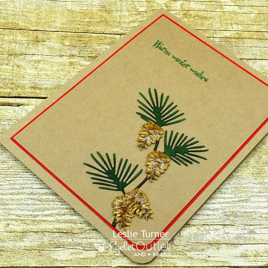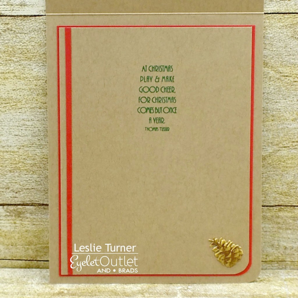 I cut the card base from CutCardStock Basis Red cardstock along with layering panels from CutCardStock Basis Natural and a print in the Hot Off The Press Christmas Memories 6×6 double sided paper pack. I stamped the deer image from the Prickley Pear Stamps Santa and Rudolph stamp set in Memento Espresso Truffle ink on Basis Natural cardstock, colored it with alcohol markers and cut it with the coordinating Prickley Pear Stamps Santa and Rudolph die.