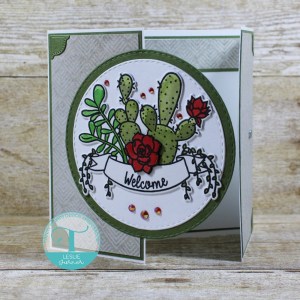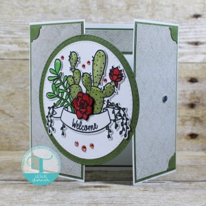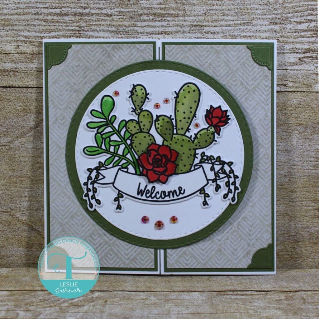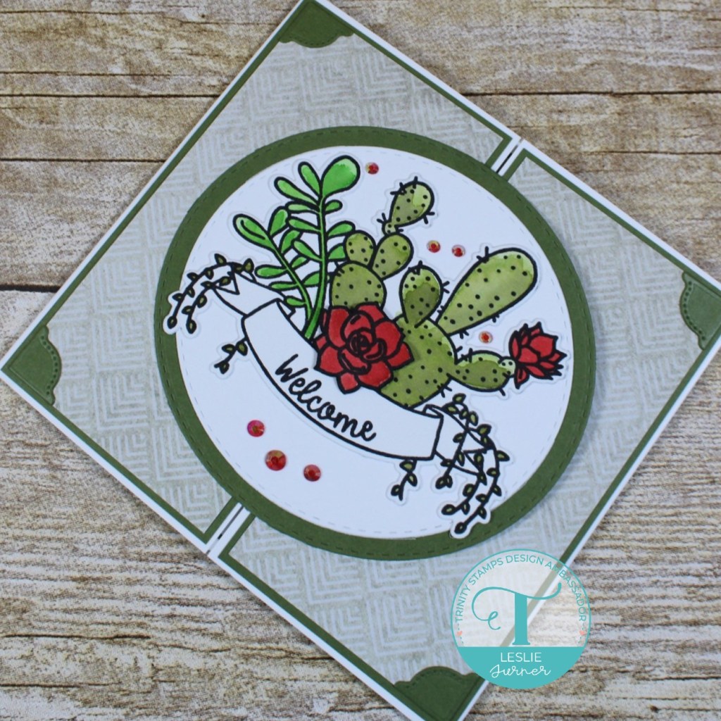 Hi friends! Happy Hump Day – I hope your week is going well! We sure are enjoying the weather out here… we’ve had some over-cast days with rain here and there for over a week now, and we’re waking up to glorious temps in the 50s! Affiliate links are used in this post at no cost to you. I really appreciate your support! I’ve popped in this morning with another Trinity Stamps inspiration project – a pretty ‘welcome neighbor’ gatefold card created with the gorgeous Succulent Banner stamp set and coordinating Succulent Banner die set, embellished with Ruby Radiance Embellishment Mix. I don’t watercolor very often but I did break out some watercolor paper, distress inks and my Niji brush for this one!
