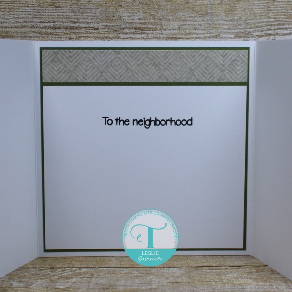 I cut the inside panel from Neenah Classic Crest 80# Solar White cardstock, embellished it with strips of CutCardStock Pop-Tone Jellybean Green cardstock and P13 Always and Forever papers used on the front, stamped the sentiment in Ranger Black Soot archival ink, and layered the panel on the green cardstock.