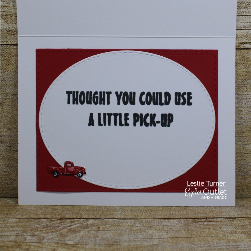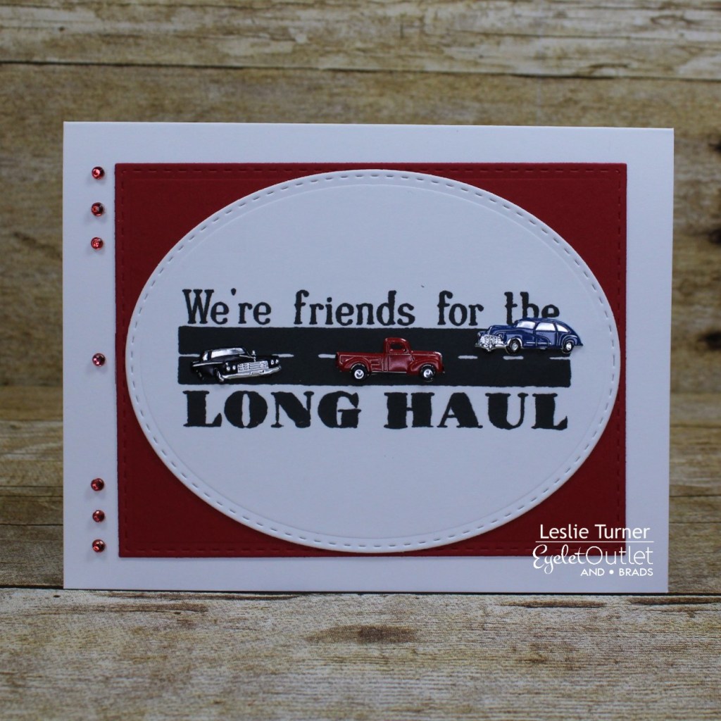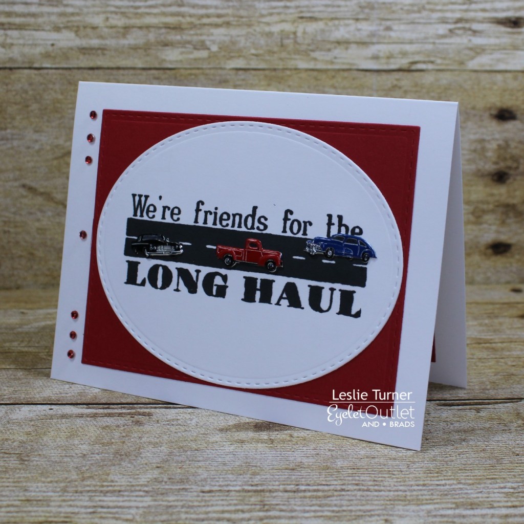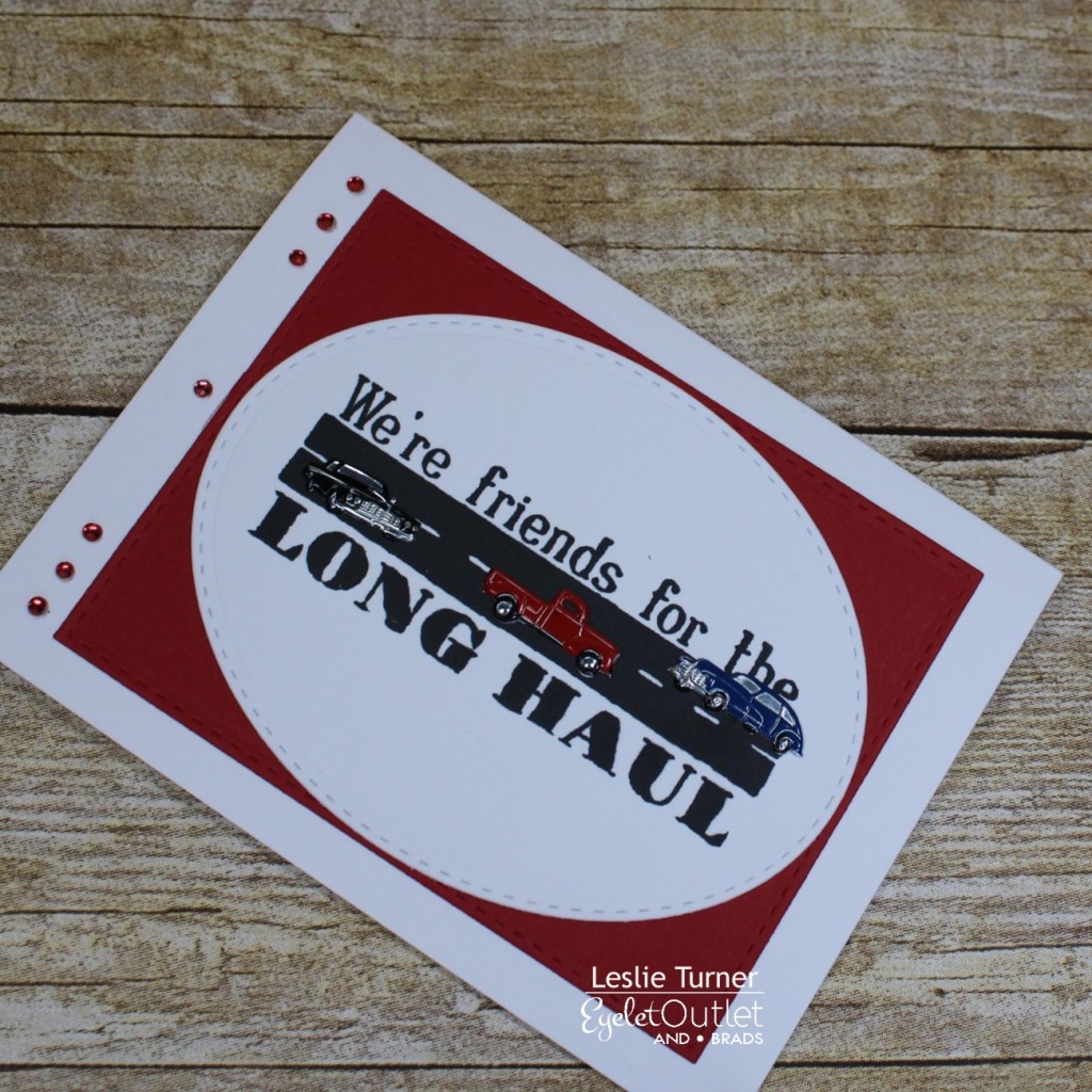 Hi everyone! A very Happy Saturday to you – I hope you’ve had a great week! Affiliate links are used in this post at no cost to you – I really appreciate your support! I’m stoked to be back on the Eyelet Outlet blog today with another awesome DT inspiration project! I created a friendship pick-me-up card using our Truck Stamp Set with matching Truck Brads along with our Car Brads and some Red Jewel Bling. I know I’ve mentioned before that I love our stamps and matching brads, or matching brads and washi tape. So much fun!