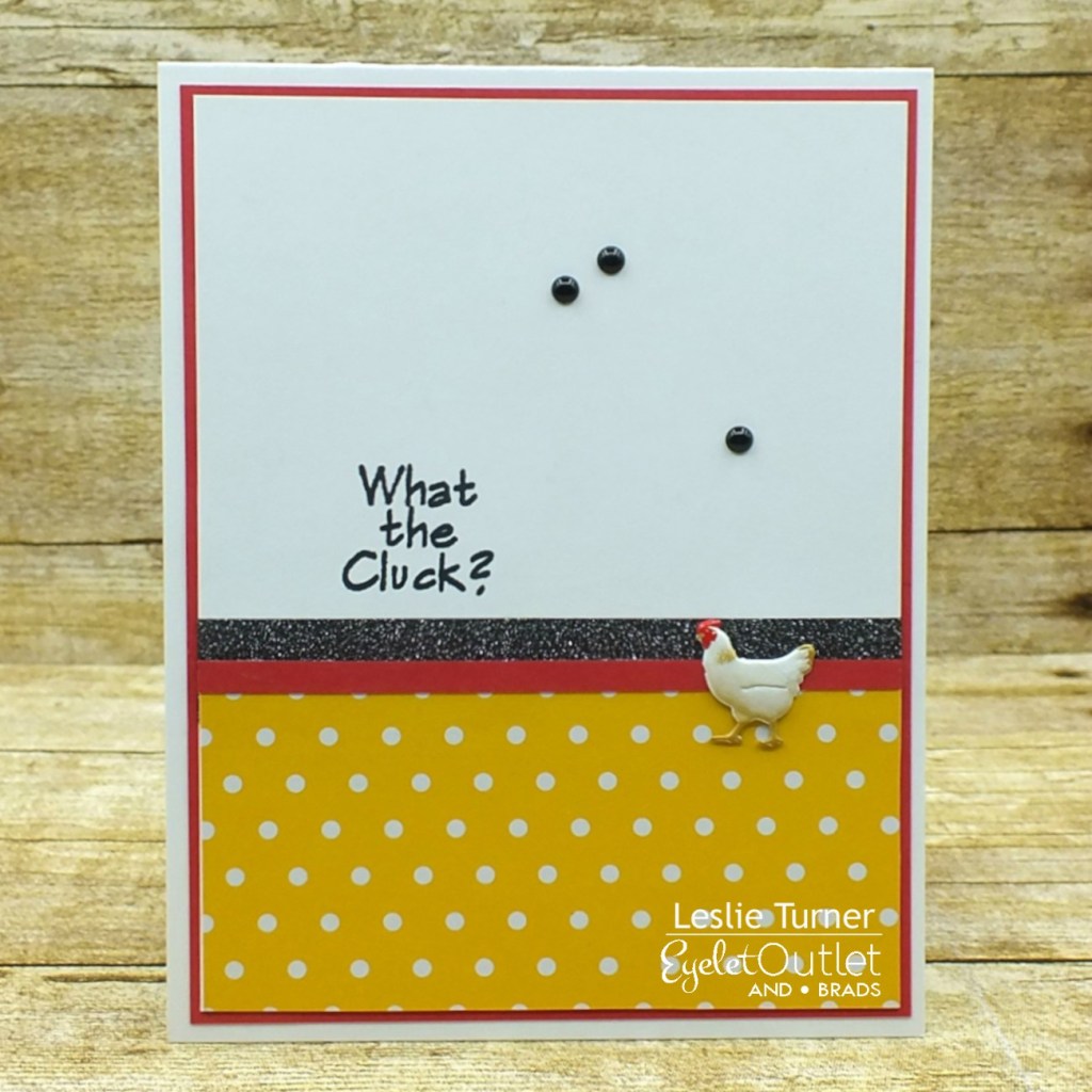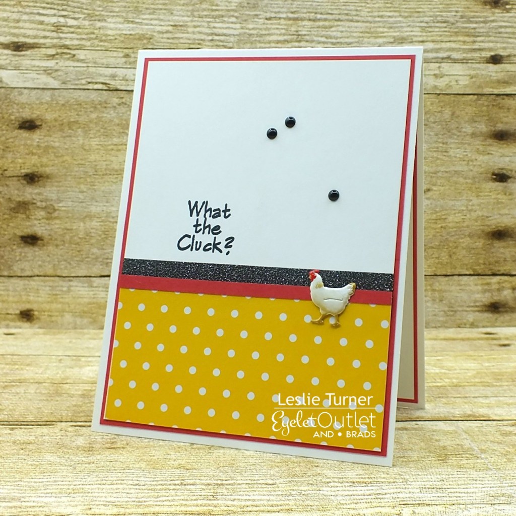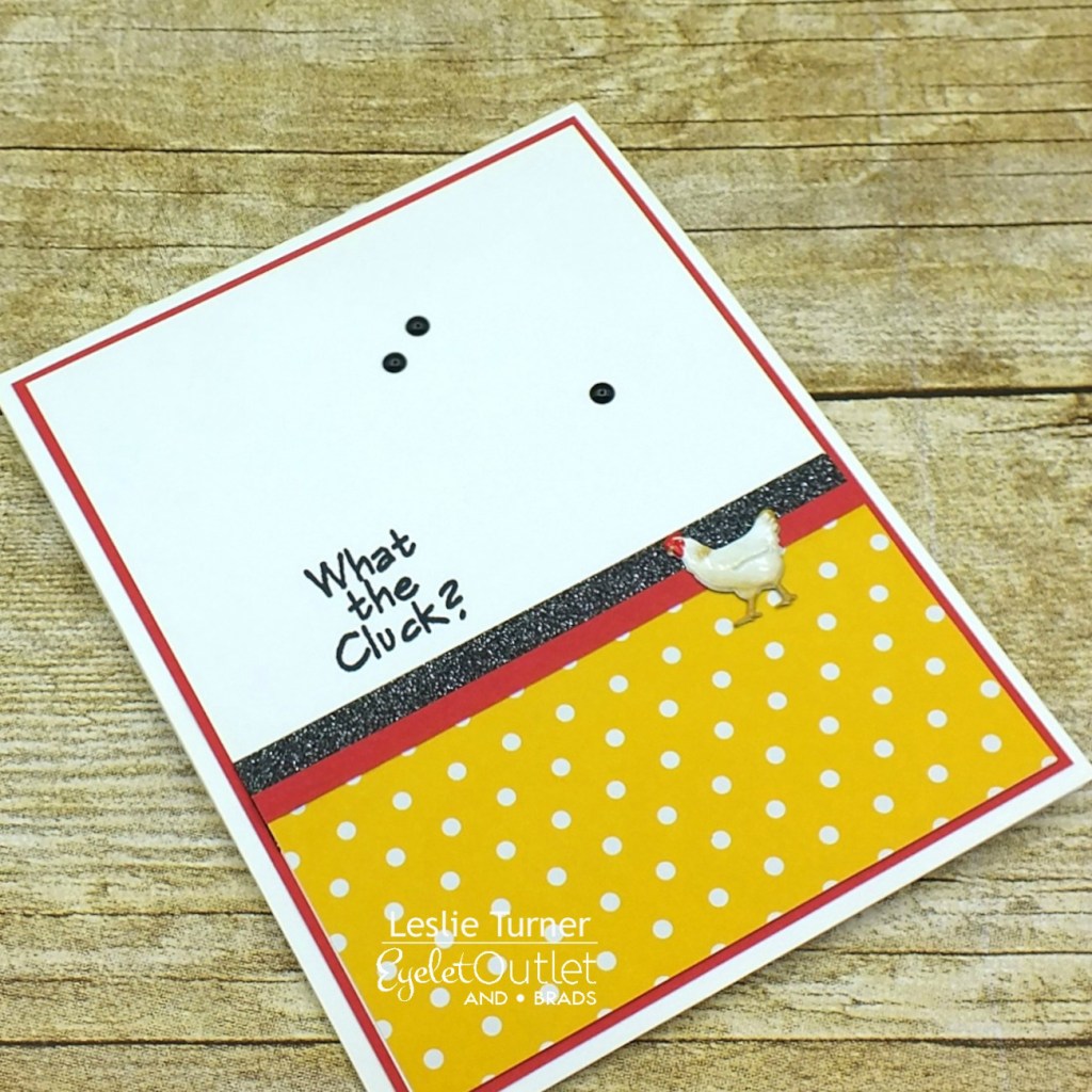 I still had these brads and stamp set out on my desk from another card I made which will be showcased in a few months, and I couldn’t help myself… I had to make another card with them! I created a top folding card base from Neenah Classic Crest Solar White cardstock and went with a yellow and red color combo which I thought complimented the chicken nicely. The dotted cardstock is some of my favorite so I used a scrap of yellow and white dotted across the bottom of the Neenah Classic Crest Solar White cardstock background panel, topped it with a stripof Glitter Black Washi Tape and then added a thin strip of red cardstock. I added one Chicken Brad, stamped the sentiment in black ink and layered the panel on the red cardstock. I adhered the panel to the card base, and the finishing touch was the addition of several Black Enamel Dots.
