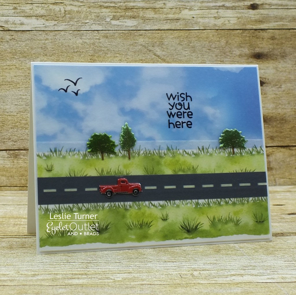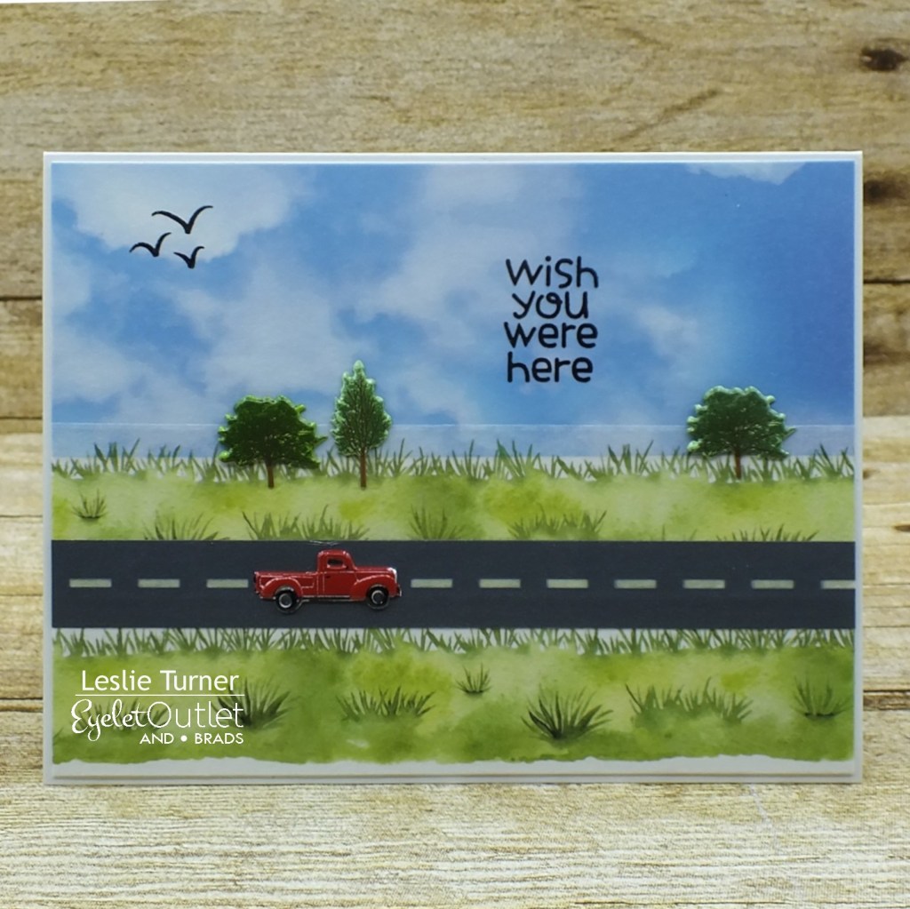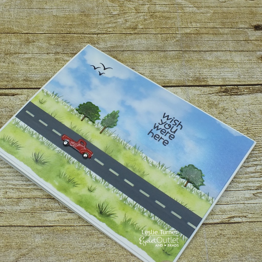 I created a top-folding A2 size landscape card base and a slightly smaller panel from Neenah Classic Crest Solar White cardstock and built my country road scene from Sky Washi Tape – Wide, Grass Washi Tape and Road Washi Tape. I added the little Red Truck Brad and some Summer Tree Brads, and then stamped the birds and sentiment in Jet Black ink.