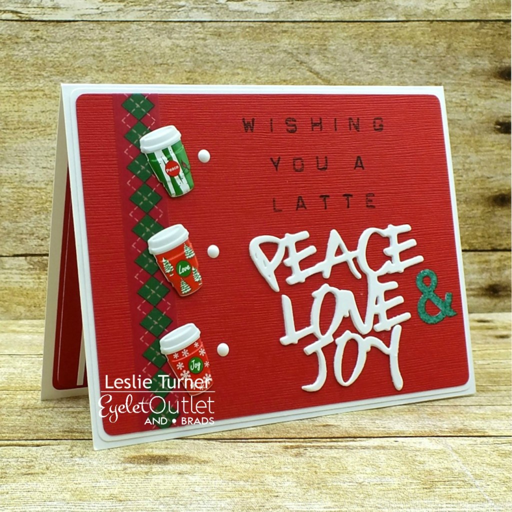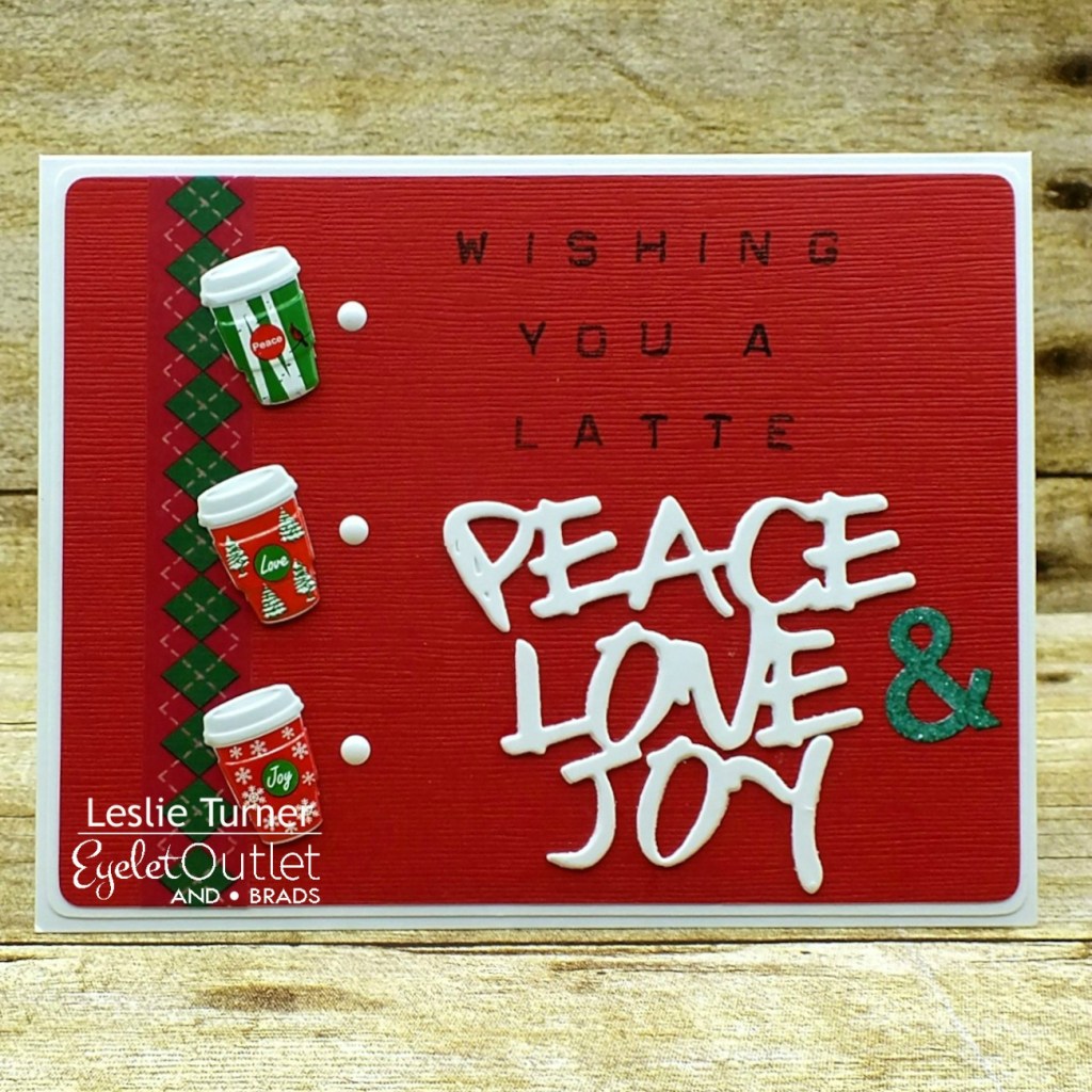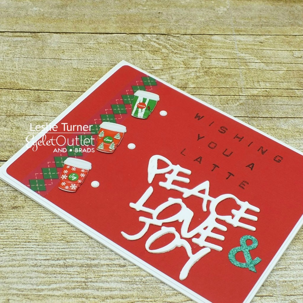 Hello friends! How’s the weather where you are? We have a good bit of snow on the ground and I’m happy as I can be – I love me some snow! Affiliate links are used in this post at no cost to you. I really appreciate your support! I’m thrilled to be back on the Eyelet Outlet blog today with another awesome DT inspiration project! I created a card with a latte Christmas wishes on it! Imagine my surprise when I discovered I had a die with the same sentiments on it as these adorable little coffee cup brads! Completely coincidental!