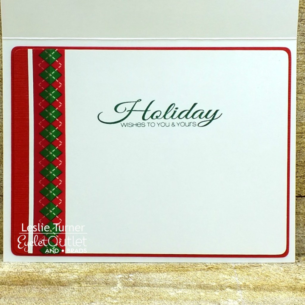 I embellished the inside panel with a strip of red textured cardstock, a very narrow strip of white cardstock and a strip of the Christmas Pattern Washi Tape. I rounded the four corners, stamped the sentiment in green ink and layered the panel on the red textured cardstock.