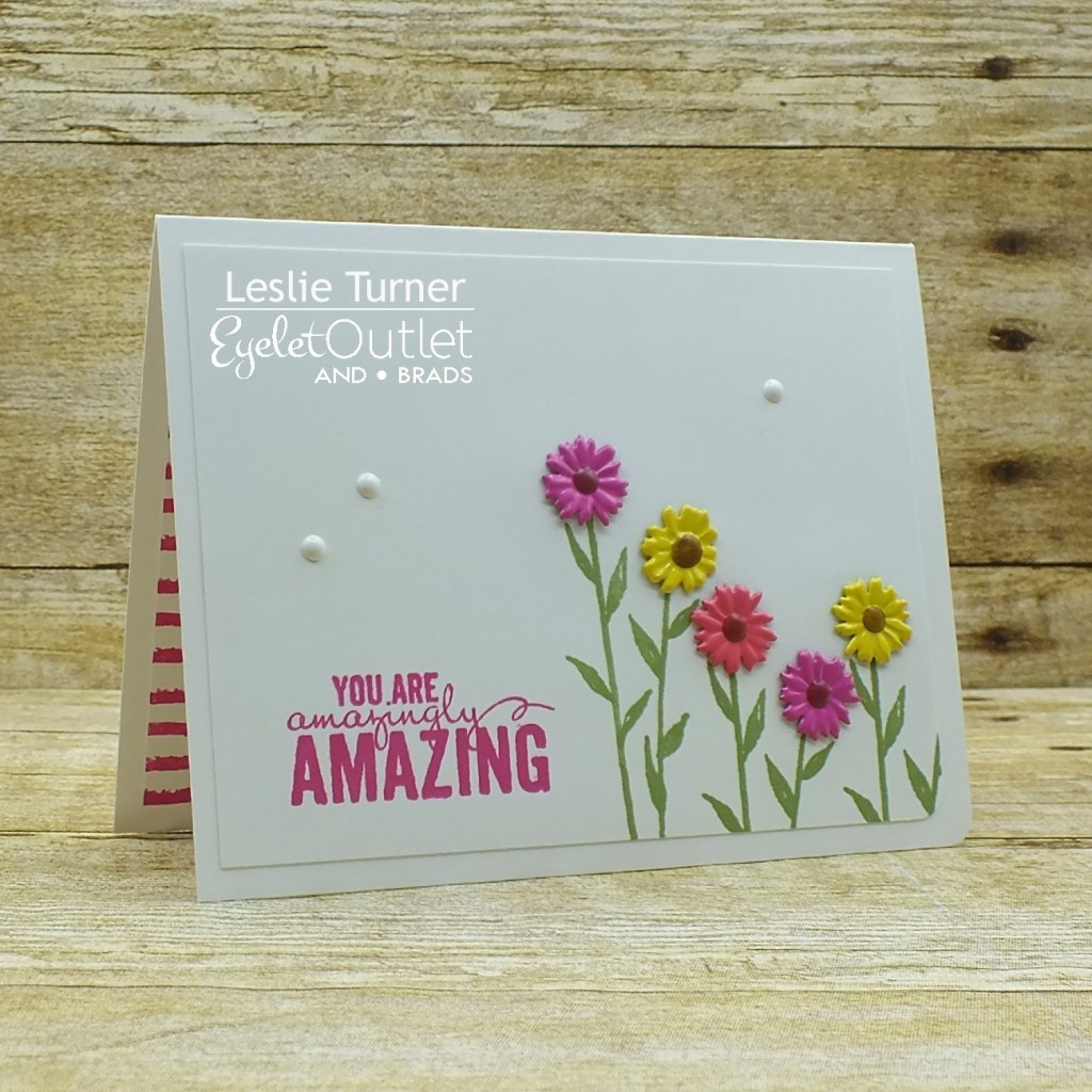 I cut a standard A2 size top-folding landscape card base and a layering panel from Neenah Classic Crest Solar White 110# cardstock and rounded the bottom right corner. I stamped flower stems and leaves in green ink in the bottom right quadrant of the layering panel, and then stamped the sentiment in pink ink just to the left of the stems and leaves. I added five Colored Daisy Brads and adhered the panel to the card base. The final touch was adding several White Enamel Dots to complete the front panel.