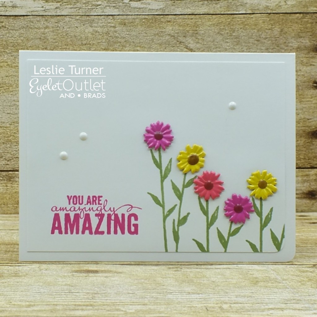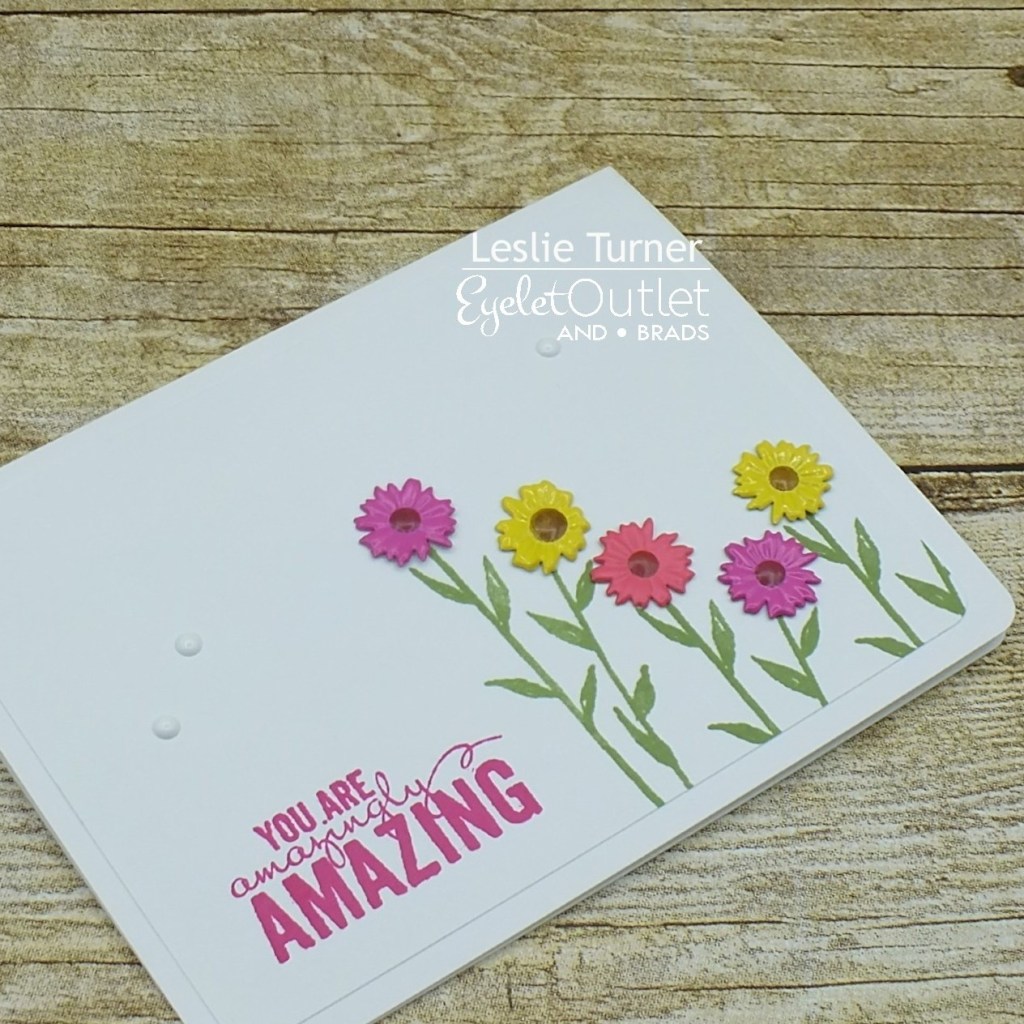Hi everyone! A very Happy Saturday to you – I hope you’ve had a great week! Affiliate links are used in this post at no cost to you. I really appreciate your support! I’m happy to be back on the Eyelet Outlet blog today with another awesome DT inspiration project! I created a pretty clean and simple thank you card using more of the new brads in the store along with my favorite enamel dots! This card came together really quickly!