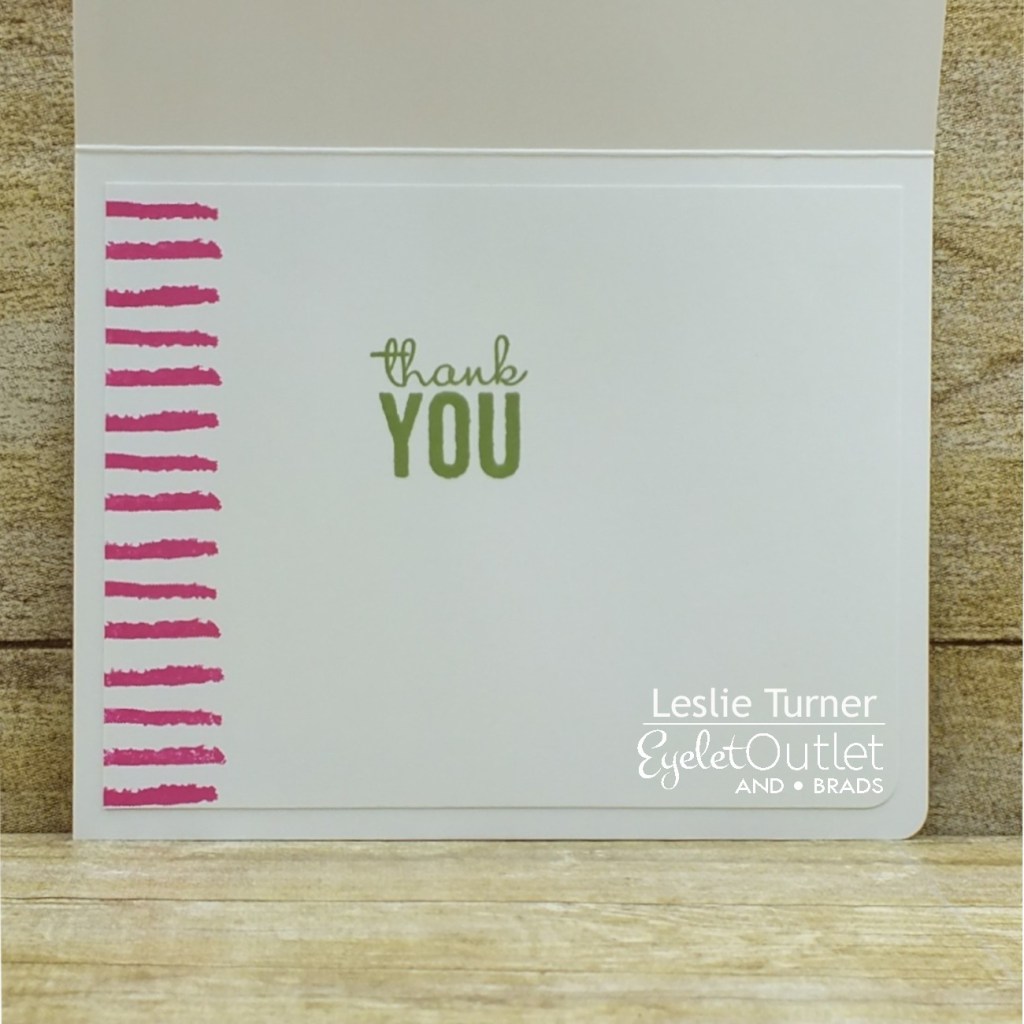 I cut the inside panel from Neenah Classic Crest 80# Solar White cardstock and embellished it with a strip of pink striped paper, stamped the sentiment in green ink and adhered the panel directly to the inside of the card base.