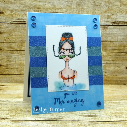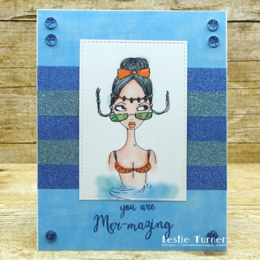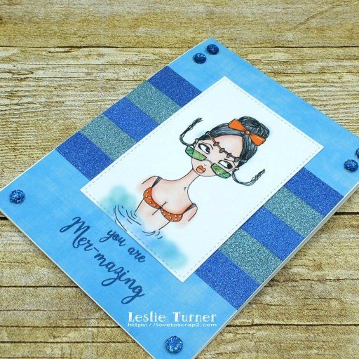 Using the pre-colored version of this image, I kept with a blue color scheme which seemed perfect for a mermaid. I alternated teal and blue glitter Washi Tape across a blue digital paper background and then adhered it to the card base. I cut the image with a stitched rectangle die, adhered it to the front and stamped the sentiment beneath it in blue archival ink. I added Glossy Accents to her sunglasses and finished the front with sparkly blue bling.