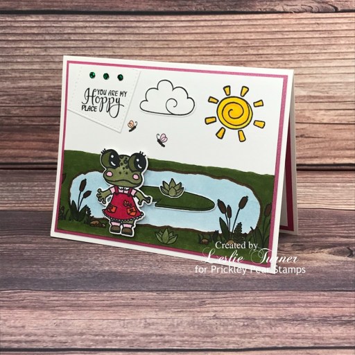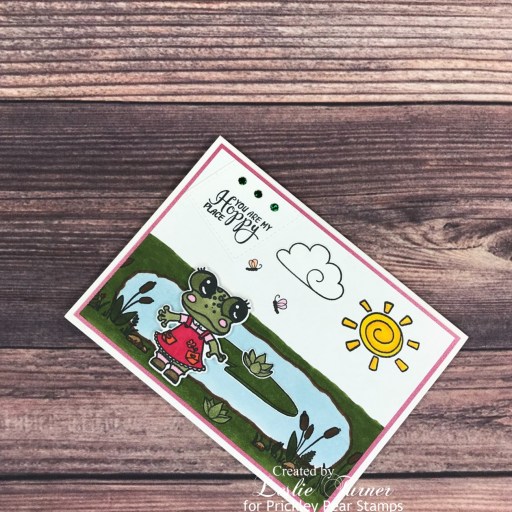 Hey everybody! I hope you’re having a wonderful weekend! We traveled this past Friday for Ed to have a melanoma removed from his left forehead. The surgeon had to take a skin graft from his right neck, and he is doing well, but the hardest part is keeping him still! We’ve had a bit more snow over the past couple days too, so that makes for nice cozy days indoors. ;) Affiliate links are used in this post at no cost to you – I really appreciate your support! I’ve stopped in this morning to share yet another sample I created for the Prickley Pear Stamps new release. This sweet card features Ramona from the new Frog Pals Spinach and Ramona stamp set along with the coordinating Frog dies! OMGoodness, these frogs are so stinkin’ cute, I can’t stand it! I’ve really enjoyed creating little scenes with this stamp set.