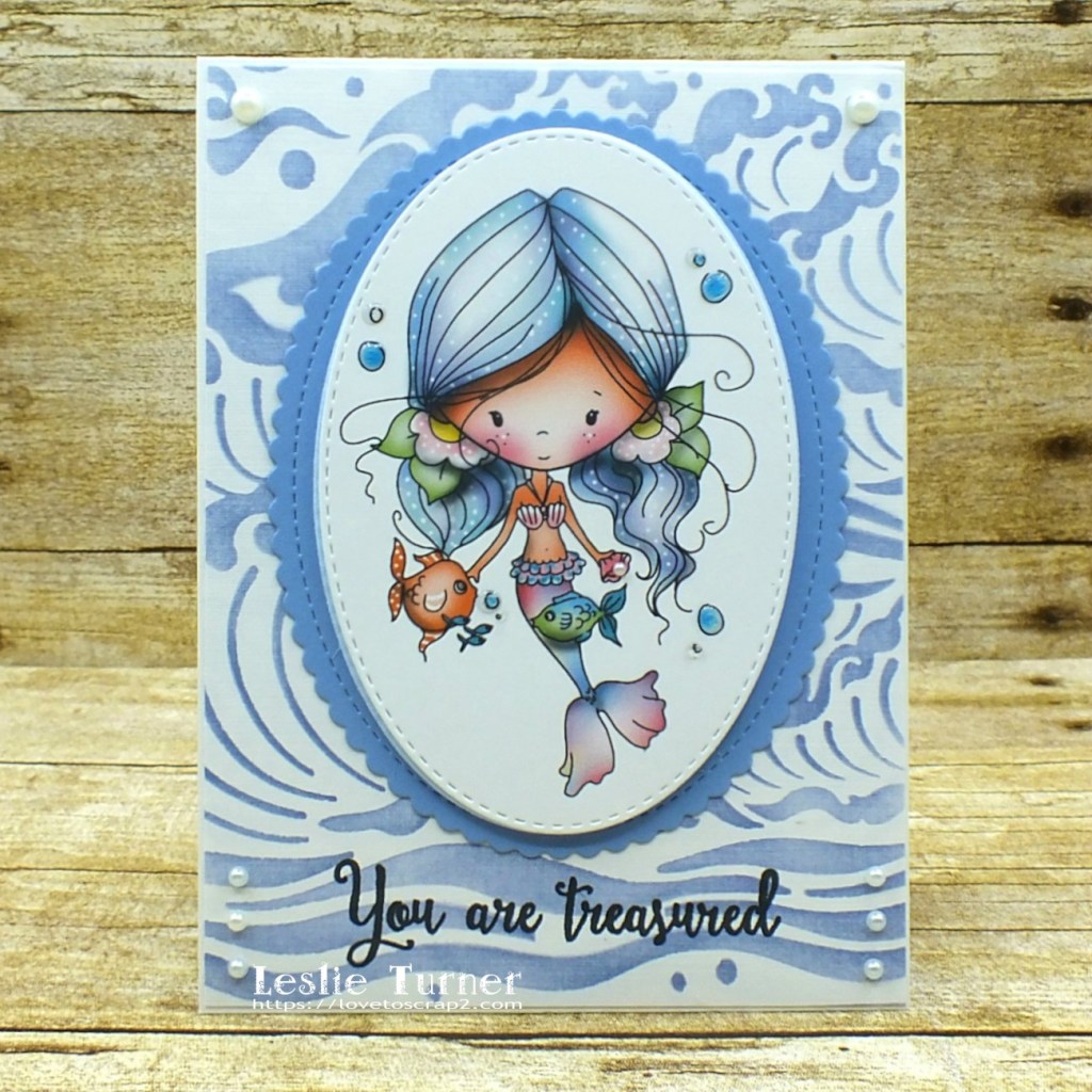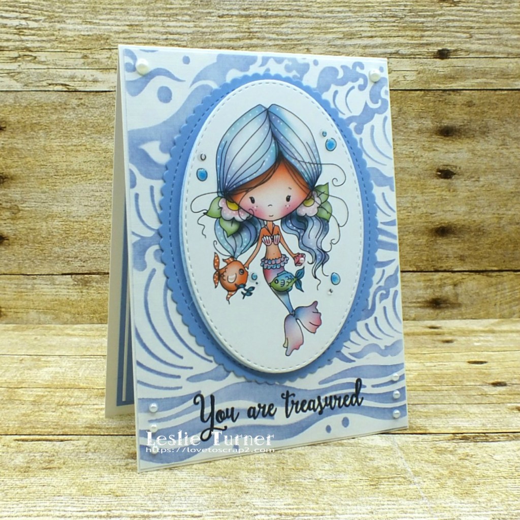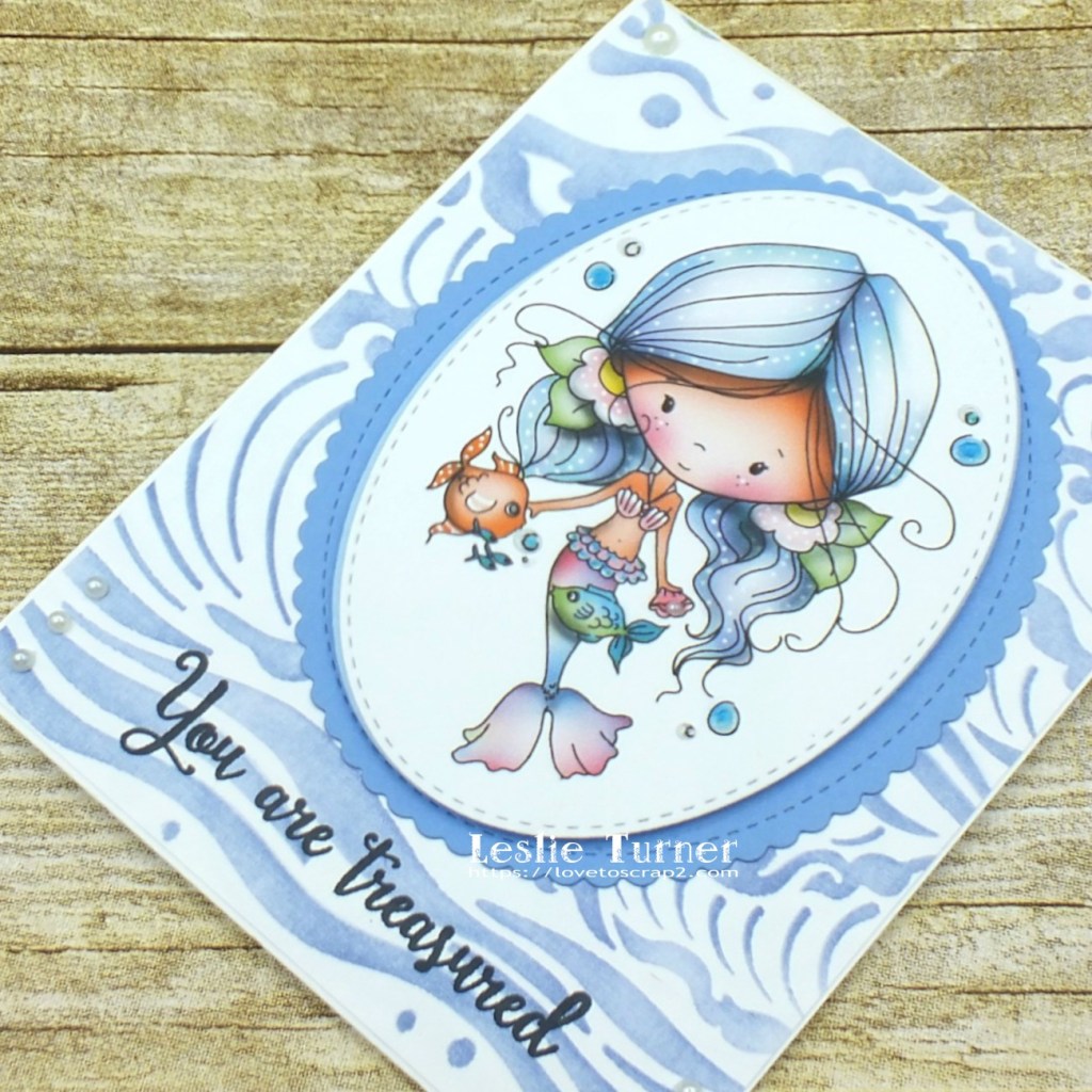 For this hybrid mermaid card, I started with a sea waves stencil and distress ink to create the background panel and adhered it to the card base. I purchased the Winnie Mermaid Kisses pre-colored digital image for my stash which I printed on Neenah Solar white cardstock and cut with a stitched oval die. I cut another stitched oval from light blue craft foam – one of my favorite tricks is to layer colored foam beneath an image so that the color peeks out from around the edge. I adhered the focal image to a slightly larger mini scallop die cut, then stamped a mermaid sentiment in black ink toward the bottom of the front panel. I added one tiny pearl to the clam shell she’s holding, some dimensional magic to the underwater bubbles, and a few flat-back pearls to the corners of the stenciled background.