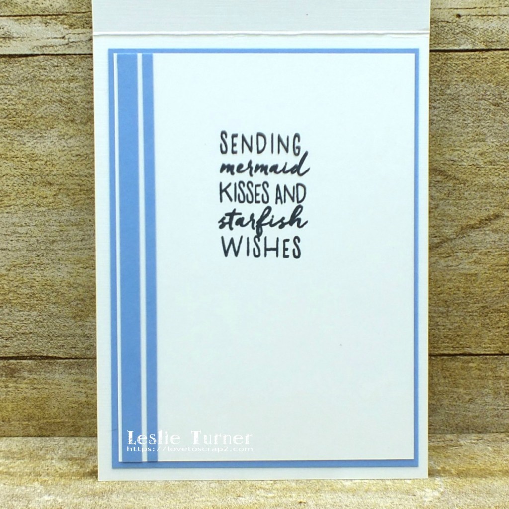 I embellished the inside panel with a couple strips of blue cardstock and stamped another mermaid sentiment in black ink.