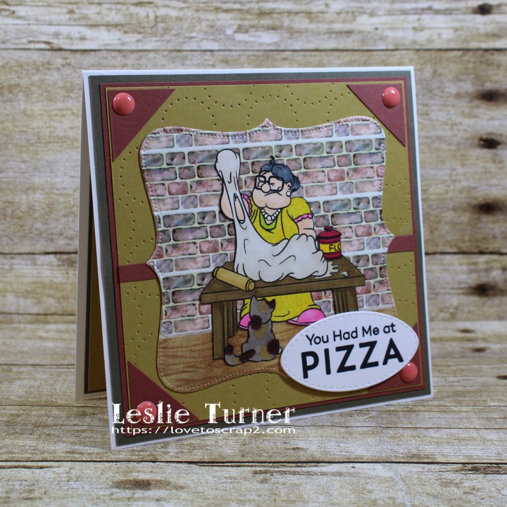 Howdy peeps! I hope you’re having a great day! We’re having some gorgeous Spring weather here, and as much as I love being in my studio, I feel a little guilty that I’m not outside enjoying the sunshine and light breeze! Affiliate links are used in this post at no cost to you. I really appreciate your support! I’ve popped in this morning with a thank you card of sorts that I created for The OutLawz May Freebie/Progressive Challenge! Our sponsor this month is Dr. Digi’s House of Stamps and we were gifted the awesome Bertha Bread Baking Bonanza digital image for this challenge! I know I’ve mentioned that a free digital image from the sponsor is the perk for playing in this challenge every month. And yep, I definitely LOL’d – literally – when I saw this image! I LOVE Dr. Digi’s sense of humor! Bertha’s got some bread dough going on there and since I have absolutely no bread or bread-related stamps, I had to come up with Plan B which was pizza dough! ;)