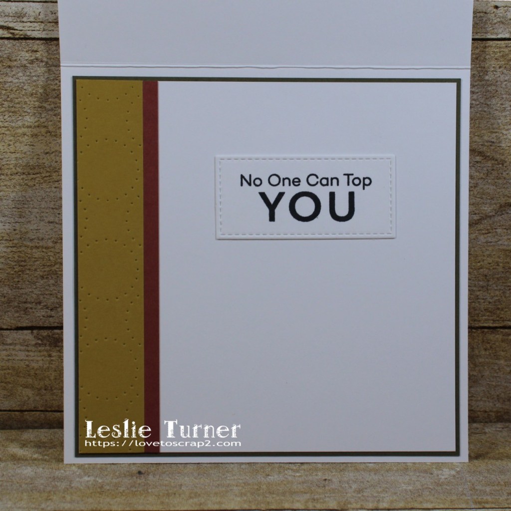 I cut the inside panel from Neenah Classic Crest 80# Solar White cardstock and embellished it with Saffron Spice and Americana cardstock strips. I stamped the sentiment on a Solar White scrap and cut it with a stitched rectangle die, then layered the panel on Olive Twist cardstock.