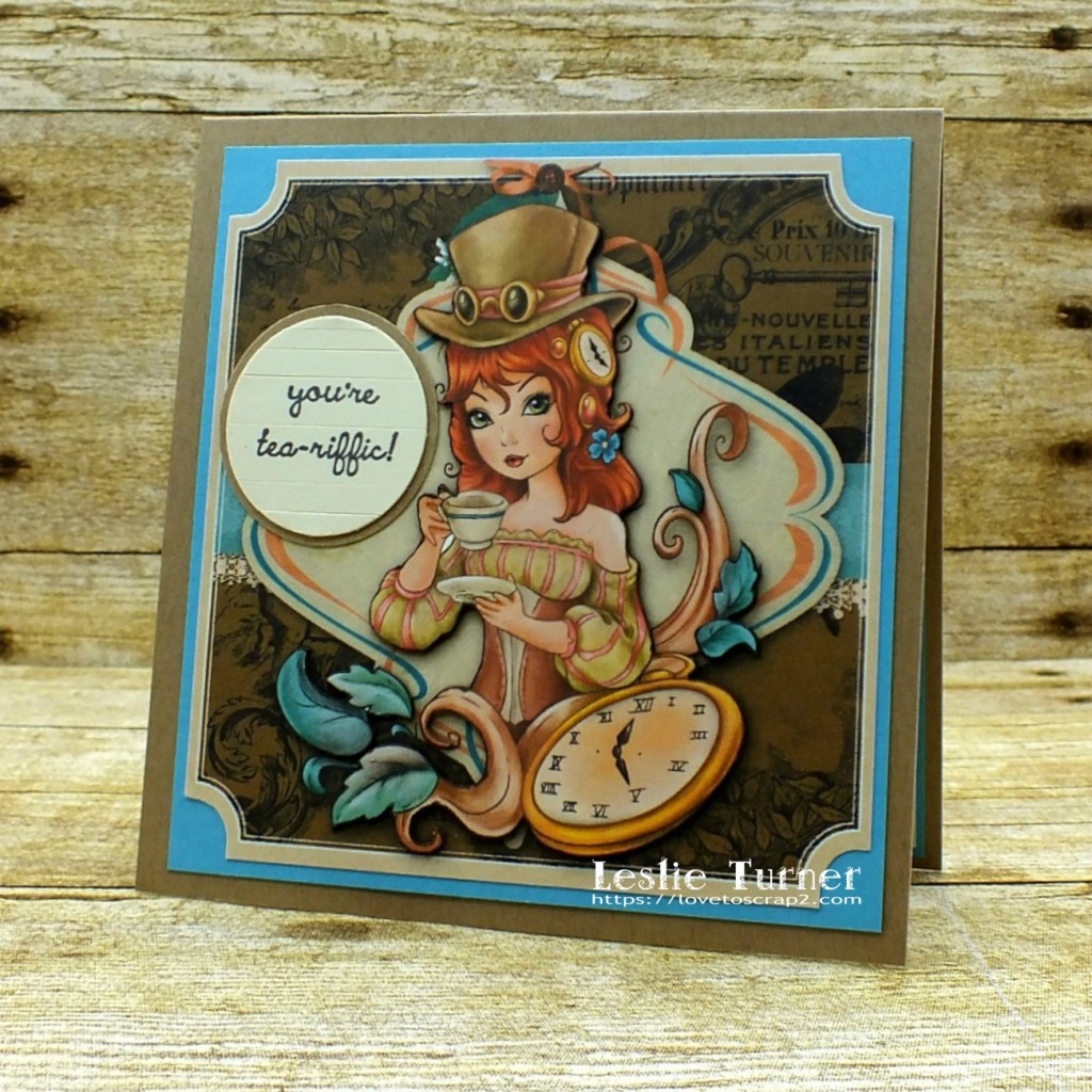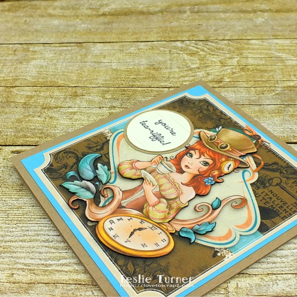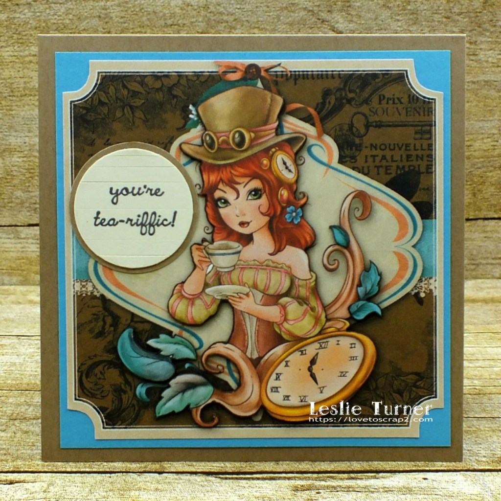 I’m not really a steampunk fan but this image is rather ‘steampunky’ and I love it! I printed the full image once on the background paper and then printed just the girl and leaves/flourishes two more times which I fussy cut and layered one on top of the other. I ran a brown marker around the edges for a more finished look and then adhered them on top of the full image for some dimension. This technique adds a lot of interest. I layered the background on turquoise cardstock and then adhered it to a kraft card base. I stamped the sentiment on ivory cardstock in strips and then punched it with a circle punch. I punched a slightly larger circle from the kraft cardstock and layered them together.