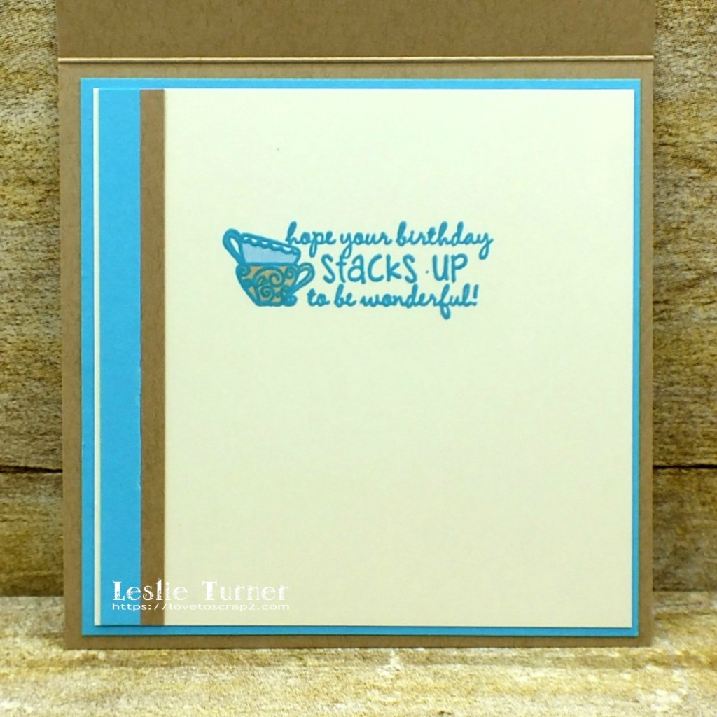 I embellished the inside panel with leftover strips of the turquoise and kraft cardstock used on the front, and stamped a birthday sentiment from the same tea stamp set in turquoise ink. I colored the two little tea cups with alcohol markers.
