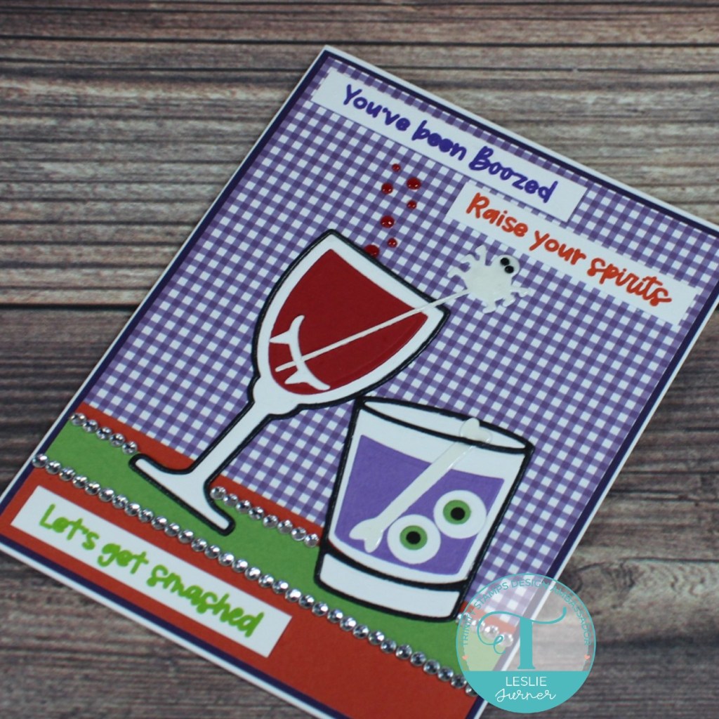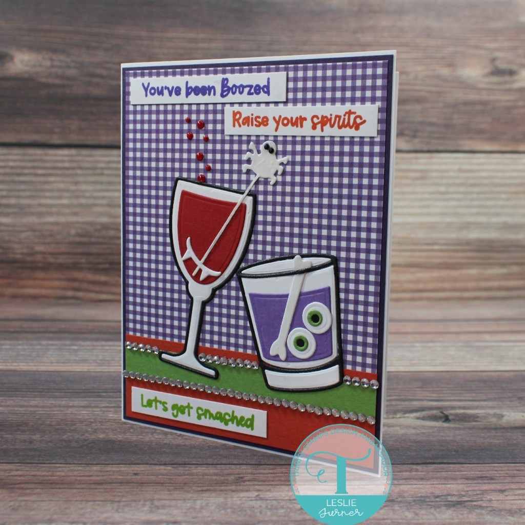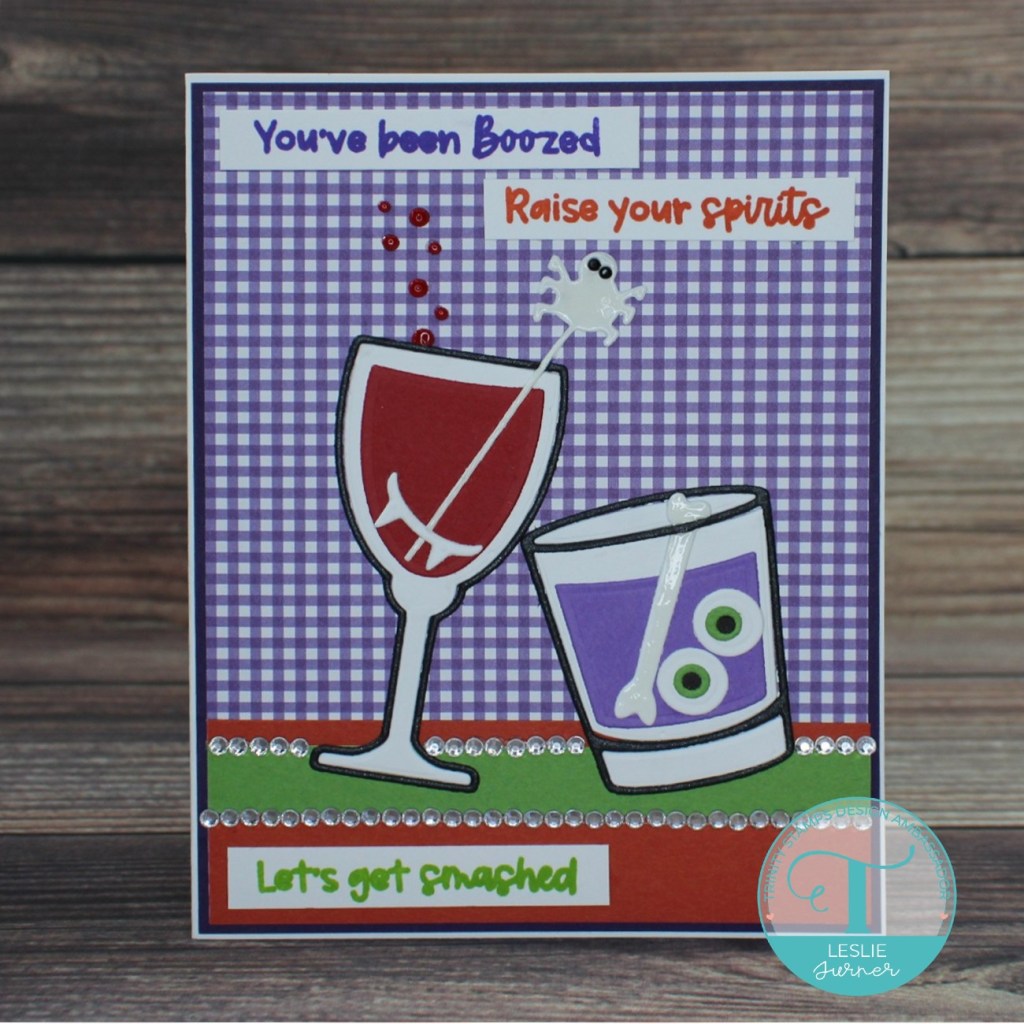 I cut a standard A2 size side-folding card base from Neenah Classic Crest 110# Solar White cardstock along with layering panels from CutCardStock Basis Dark Purple cardstock and Hot Off The Press purple gingham patterned paper which I adhered together. I added embellishing strips cut from CutCardStock Pop-Tone Gumdrop Green cardstock and CutCardStock Pop-Tone Tangy Orange cardstock to the bottom of the panel. Using the Creepy Cocktails Die Set, I die cut the glasses and extra elements from Neenah Classic Crest 80# Solar White cardstock, CutCardStock Basis Red cardstock, CutCardStock Pop-Tone Grape Jelly cardstock, CutCardStock Pop-Tone Gumdrop Green cardstock, and CutCardStock Curious Metallic Night cardstock, and adhered them to the front panel. I stamped three of the sentiments from the Trick or Drink Stamp Set in purple, orange and green ink, trimmed them, and adhered them to the front panel. I added strips of clear gemstones to the top and bottom of the green embellishing strip, and then added Glossy Accents to the bubbles and tiny black gemstones as the spider’s eyes.