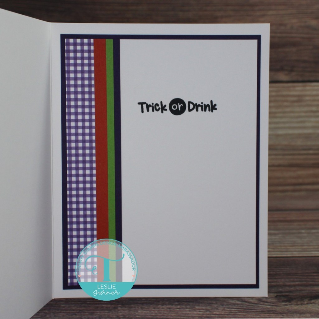 I cut the inside panel from Neenah Classic Crest 80# Solar White cardstock and embellished it with leftover strips of the purple gingham paper and red, green, and dark purple cardstock. I stamped another sentiment from the Trick or Drink Stamp Set in black ink and layered the panel on dark purple cardstock.